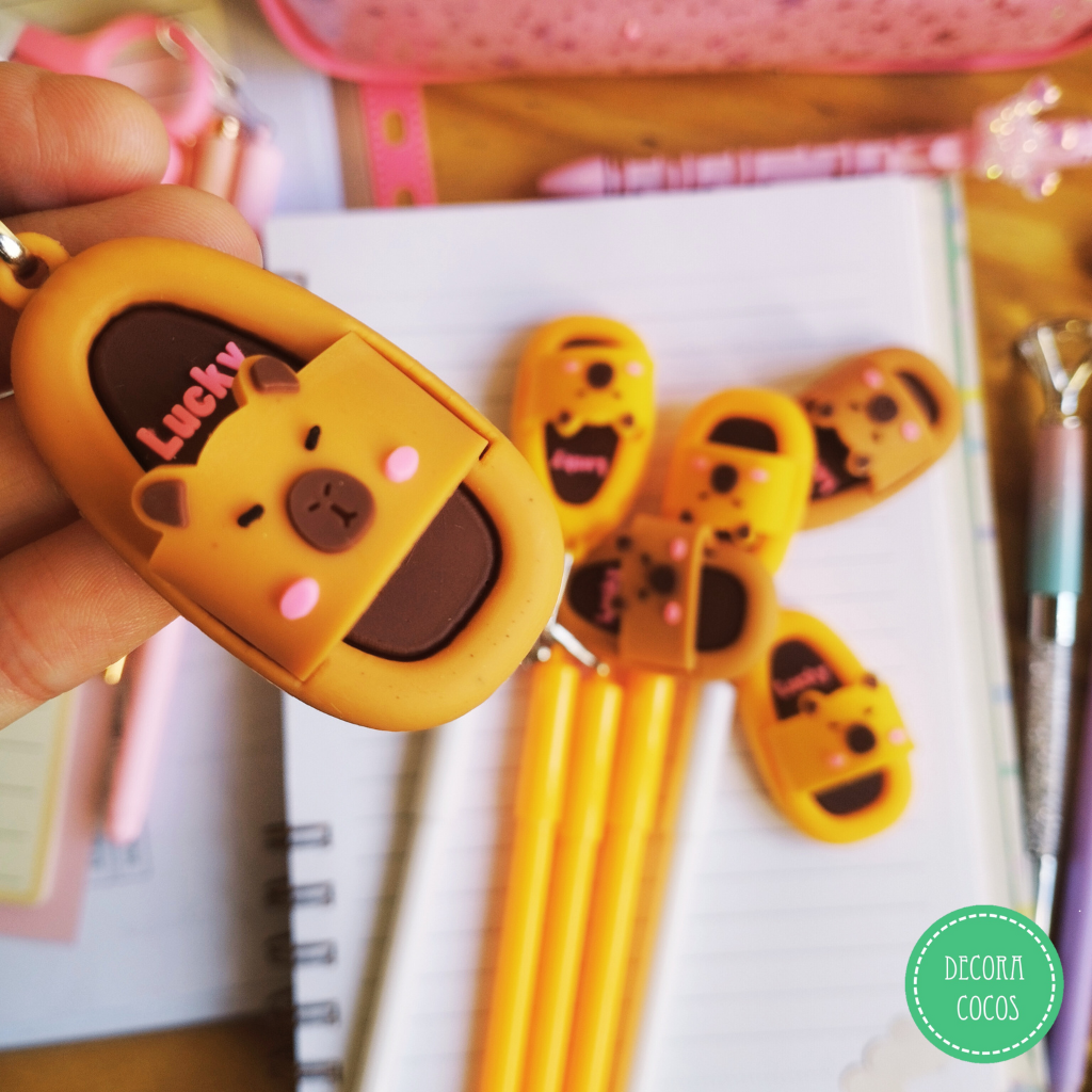 Bolígrafo Capibara ojota Tiene llaverito con un capibara colgando para usarlo en la mochila!! Punta 0.7mm tinta azul - trazo tradicional Precio por unidad Si precisás más stock escribinos!!!